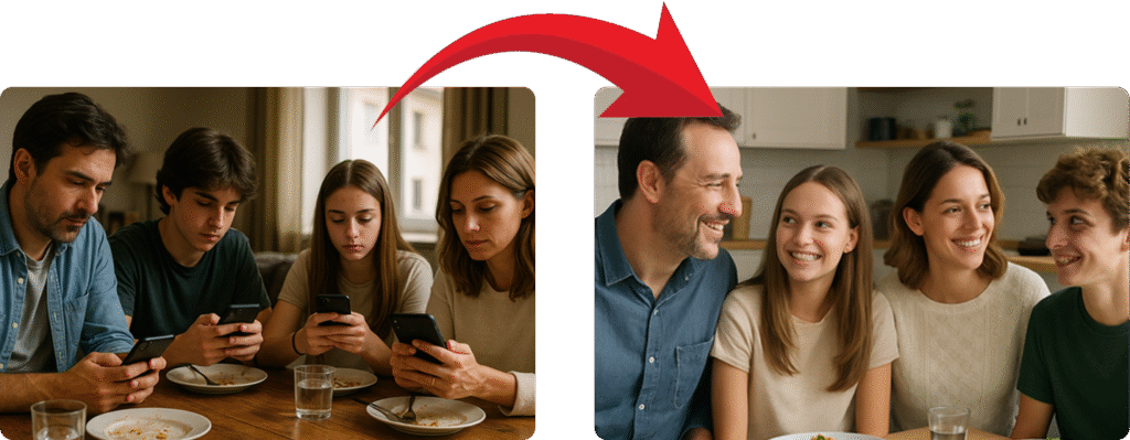 Tenha momentos reais à mesa, com conversa, risada e presença, do jeito que sempre deveria ter sido sem celular.