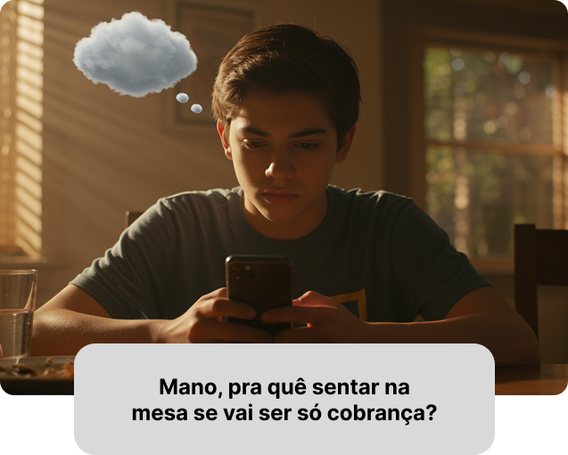 Sempre que a gente sentava à mesa (o que era raro), ninguém se olhava. Cada um no seu celular. O assunto? Trabalho, problemas, correria… Eu era o mais novo. Meu irmão mais velho tem 24 anos. E eu me sentia completamente fora de lugar. Aquilo me machucava demais. Eu só queria sentir que eu tinha uma família de verdade. Sentir que eu pertencia. Conheci o Ricardo que me ensinou o Protocolo Família na Mesa. Decidi aplicar, mesmo achando que não iam me ouvir. Mas o que eu não consegui em 17 anos, eu consegui na primeira vez. Depois de um jogo de beach tennis, convidei minha família pra mesa, do jeito que o protocolo ensina. E, pra minha surpresa, meu pai, minha mãe e meu irmão aceitaram. A gente sentou. Se olhou. Conversou. Hoje, minha relação com eles é outra. Aos poucos, fui até me afastando de amizades que não me levavam pra lugar nenhum. A vontade de beber, tem sumido da minha vida. Tudo começou com uma mesa.